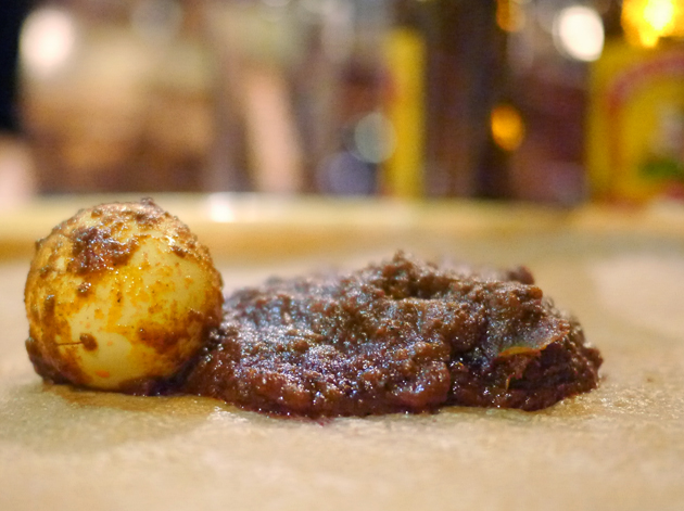 Happy Buddha and Porn Master went for the meaty version, the Beyaynetu. The minced lamb used was both tasteless and textureless, but it came in two sauces, one mild and one hot. Both were thick, a little oily and heart warmingly satisfying. The hot sauce actually had some spice to it, but it wasn’t as potent as the third part of this platter – the minchetabesh, a chilli, peppery sauce smothered over more minced lamb and, curiously, hard boiled eggs. It was so addictive, Veal Smasher ordered another portion all for himself.