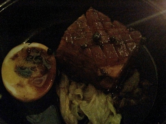 The small square of pork belly may not look like much, but it’s sublimely delicious. The tender and fatty pork is complimented exceedingly well by the thin, fruity, peppery sauce that’s moreishly addictive. The braised cabbage and egg add little to the pork, but it’s great nonetheless.