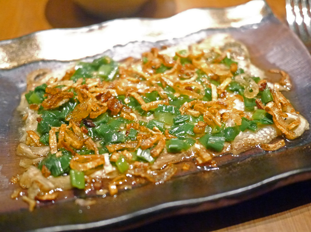 Despite its unusual appearance, the tender strands of distinctly smoky aubergine were a winner and unsurprisingly reminiscent of the Levantine dish of baba ghanoush. The topping of crispy, chewy and sweet fried shallots complimented the smokiness of the aubergine very well.