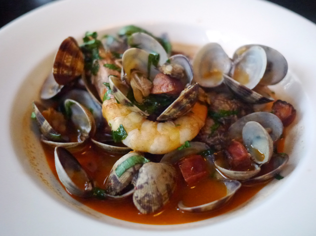 clams, chorizo and prawns in fino at 8 hoxton square