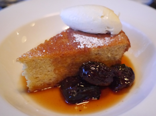 I had my eyes for only one dessert – the slice of polenta cake. There was far too much going on though. It was mildly sweet and nutty with a chewy edge and complimented well by the sweet, slightly acidic flavour of the thin marsala-based sauce. All of this was enhanced further when taken with the moderately treacle-ish prunes or the creamy mascarpone, but not both. Attempting to nom it all in one gulp proved to be a conflicting melange of flavours and textures.