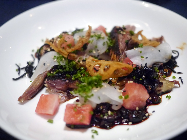 The bland taste of the slightly waxy textured duck confit was deeply unimpressive. I wasn’t sure what to make of the oddly treacly sauce that accompanied it. The tart pickles and refreshing watermelon chunks were good, but that couldn’t hide the disappointing nature of what could have been a decadent duck dish.