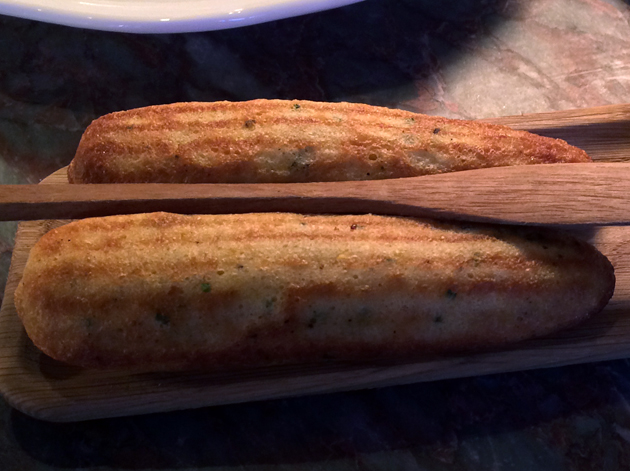 The finger loaves of cornbread look like corn dogs, but there’s nothing meaty about them. The fluffy, gently sweet and nutty fingers were served with a creamy, lightly smoky spread on the side. Not bad, but I’d prefer a more traditional take on cornbread with bolder flavours.