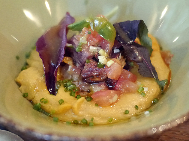 The tortilla was reasonably firm and stuffed with with sweet onions and starchy potatoes. More unusual, yet far more enjoyable, was the light, creamy and lightly sweet chickpea purée. It was studded with tender cubes of pancetta and salty bits of chorizo, making it all the more delectable.