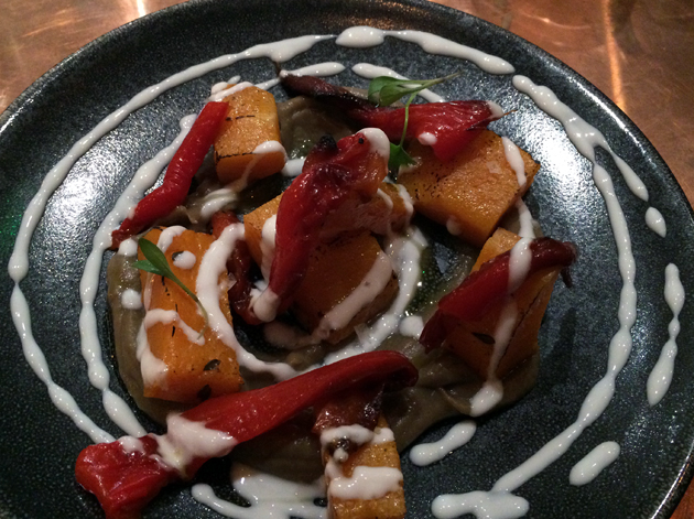 The open plan kitchen, visible from the counter seating, loves to use blow torches. Butternut squash and peppers were blowtorched, effectively bringing out their sweet and tender side, even if the heat subsided so quickly that the vegetables were cold by the time they reached me. They still tasted good, but far less convincing was the ho-hum aubergine puree which can’t compare to a good baba ganoush.
