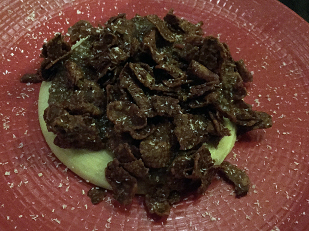 The avocado and white chocolate mousse was creamy with the strong, distinctive taste of the fruit. The heavy scattering of chocolate cornflakes on top didn’t taste of much, but did provide a crunchy contrast in texture.