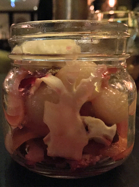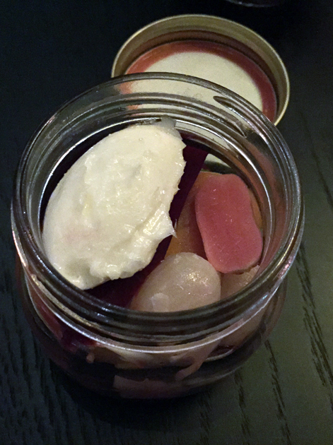 jar of pickled vegetables and whipped lardo at tredwells