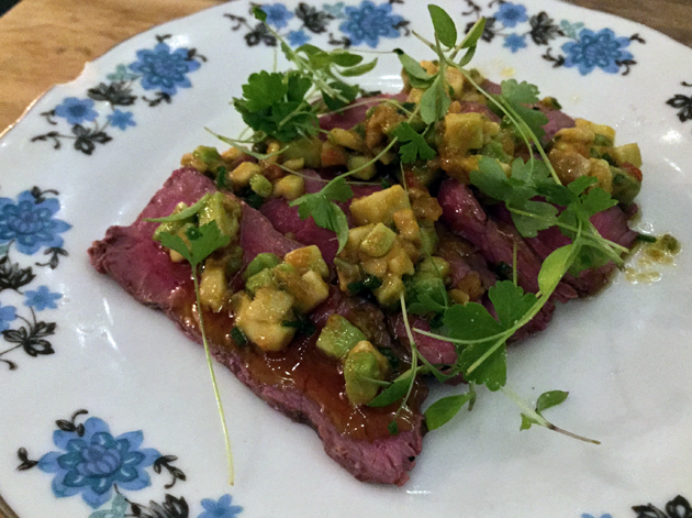 Strips of fillet steak cooked rare were tender and juicy. A fruity olive oil dressing went surprisingly well with the beef, but the punchy avocado salsa spooned on top seemed out of place and a little extraneous.