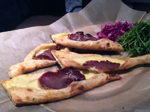 Pastrami is a much under-appreciated deli meat, especially the original beef-based versions. Sadly, the pastrami-topped pide isn’t the best showcase for it as the meat struggles to stand out against the combined creaminess of the egg and cheese and the soft fluffiness of the base. Adding some of the rocket, which is served on the side, helped boost the salty beefiness of the Bresaola-esque pastrami somewhat. Overall this was an unbalanced, but still reasonably satisfying pide.