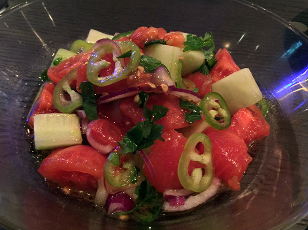 A tomato and walnut salad sounds like an excuse to throw two random ingredients together, but the two worked together surprisingly well. The cubed tomato pieces were both juicy and filled with umami-ness, while the occasional bits of crunchy walnut provided a pleasing contrast in texture.