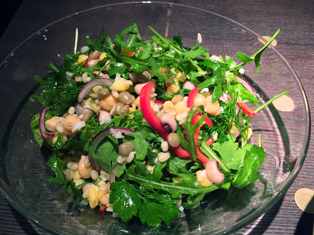 The seven grain salad was a crisp, refreshing and lip smacking medley of chick peas, mung beans, black eyed peas, rice, pine nuts, red onions, dill and parsley. It was made even better by a dressing of light and fruity olive oil.