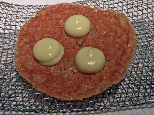 The amuse bouche continued with a trio of of thin, crispy crackers topped with an intriguing selection of creams and liquids. The first cracker was a wheaty thin topped with a trio of creamy and fruity olive oil dollops. Even better was the second cracker gilded with dollops of boldly flavoured miso and decorated with flowers. The third cracker was also florally decorated, but was a meatier affair with a bitter salmon cream and a hearty cream of chicken liver.