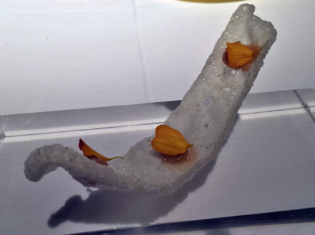 Although advertised as a beer milk foam, the bulk of this dessert was actually a soft, chewy, very wheaty cake. Globs of cream added a milky iciness and a tang of beer, while the foam itself was neutral. It’s interesting and clever, if ultimately unsatisfying.