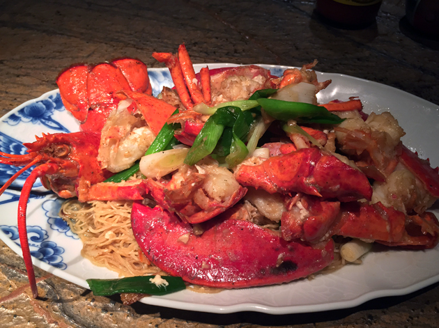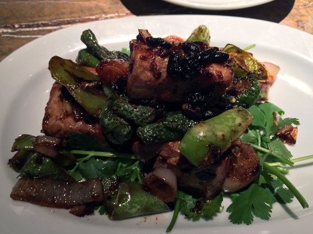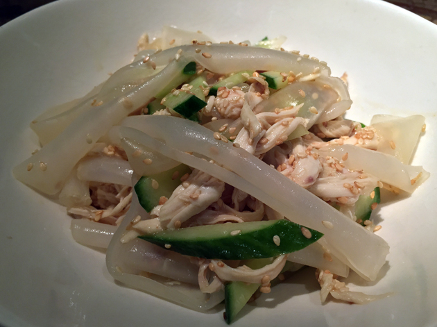 Curiously listed under the Salad section, probably because there was no where else to put it, is the chicken fun pei noodles. You would never guess that the delightfully smooth, supple, partially opaque and wide cellophane noodles were made from mung bean starch. The moist chicken shreds were fine, although the sesame oil-based dressing wasn’t as nutty or as sharp as I was expecting.