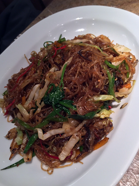 Thin and supple glass noodles were accompanied by an assorted medley of vegetables, but the noodles were a tad too oily with none of the promised pepperiness.