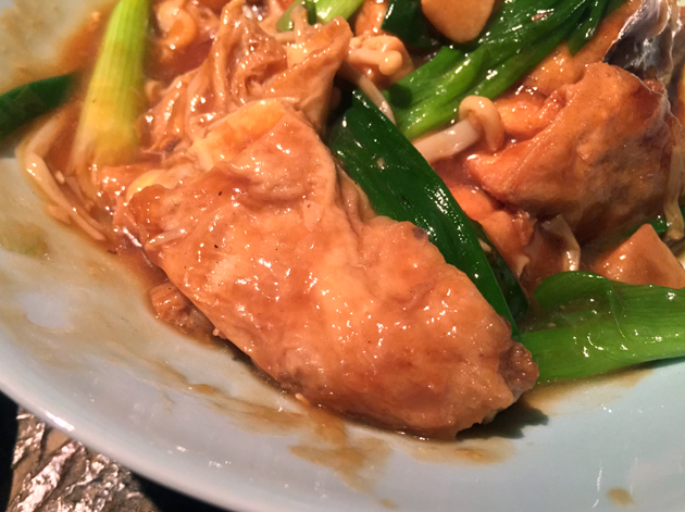 If tofu is ever to shake off its reputation as a bland, mushy dish suffered gladly only by hippies, then it needs to be used as sympathetically and skillfully as it was here. Delicately jiggly cubes of milky tofu had a wrinkly, lightly malty coating. It was joined by wrinkly, supple and thin sheets of yuba, or tofu ‘skin’, which had an addictive moreishness to go along with their sensuous mouth-feel. Both were bathed in a garlicky sauce that wasn’t too overpowering and sat on top of an unexpected, but very welcome bed of taut and silky enoki mushrooms. A class act.