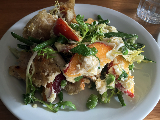 Far better was the peach and curd panzanella. The chunks of bread in this salad were hard, crunchy and somewhat stodgy. While this is a traditional element of a panzanella, I couldn’t help but wish for carbs that were softer, fluffier and altogether more complimentary to the other, more pleasing elements of this salad. The delicately sweet, but still unmistakably fruity peach slices dovetailed neatly with the milky bits of fluffy curd and the crunchy runner beans. It’s an almost perfect summer dish – light yet distinctly flavoursome.