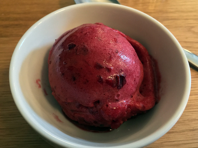 If you just want an icy treat all by itself, you could do far worse than the sour cherry sorbet. Although the single scoop was a little miserly, it was icy without being bracingly, uncomfortably cold. The flavour was very true to the fruit – sour and almost syrupy in its sweetness, it was unmistakably sour cherry.
