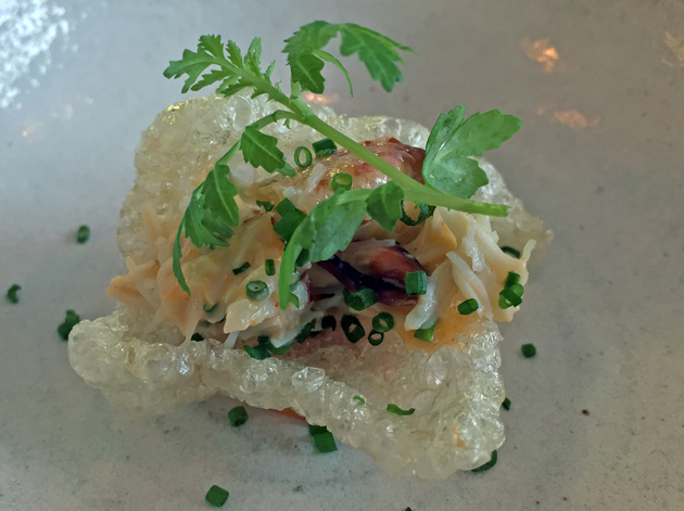 Crab Crackling is just a few words away from an amusing alliterative allusion, but this amuse bouche was lacking in more important ways too. The moist, lightly oily crackling pork skin was unctous and crunchy, but the chilled crab spooned on top left me unmoved, while the hints of spice and sourness were far too transient.