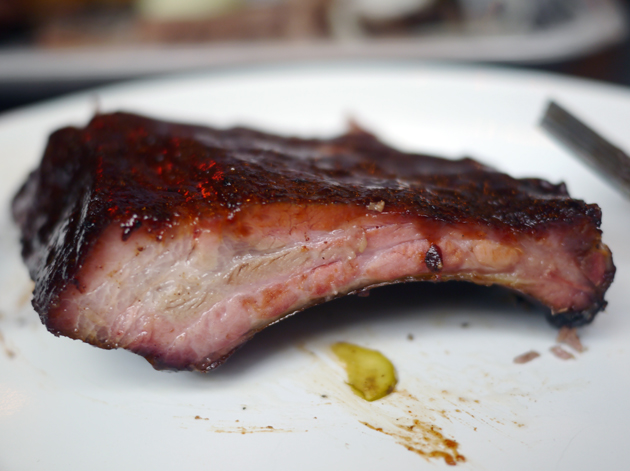 The beef short rib had a peppery bark similar to that found on the brisket, but was noticeably tougher and thus aptly earning its name. Biting my way through it wasn’t too much of a chore though. The cow flesh underneath was noticeably smoky and tender, but it wasn’t moist or fatty enough. The relative dryness of the meat was compounded by its relative blandness compared to the best barbecue beef short ribs as well as the paucity of collagen on the bone. It’s not bad, but it was a disappointment following the superb brisket. You can do better.