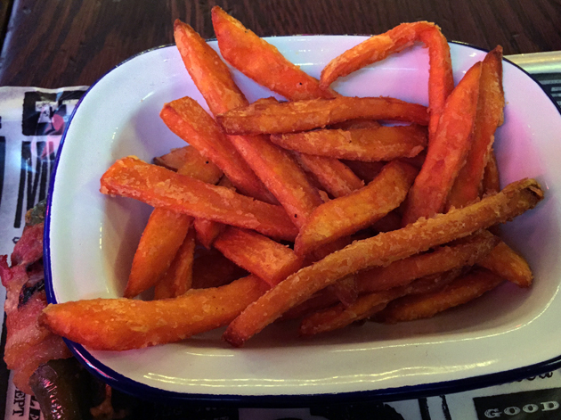 The jalapeño wrapped in streaky bacon accompanying the burger was moderately spicy. The sweet potato fries were crisp and free from excess oil, but had only a very muted sweetness.