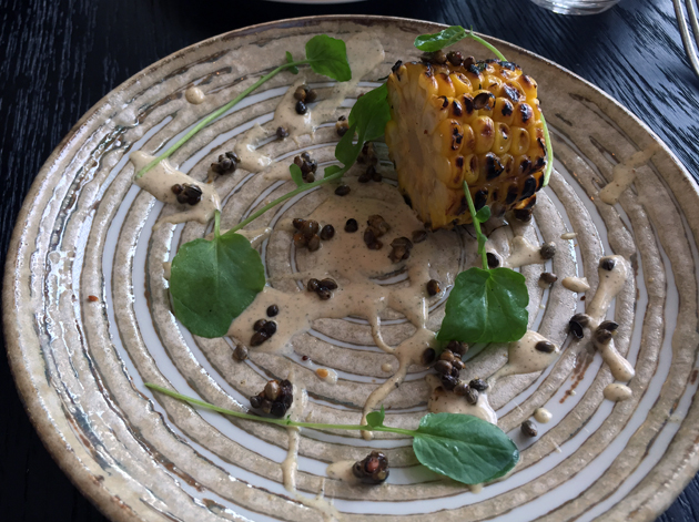 I quickly set aside my cutlery when tackling the small segment of grilled sweetcorn – if only because it made it easier to smear the cob with the scattered hemp seeds. The latter had a surprising popcorn-like flavour which went with the corn like a horse and carriage. Scumptious.
