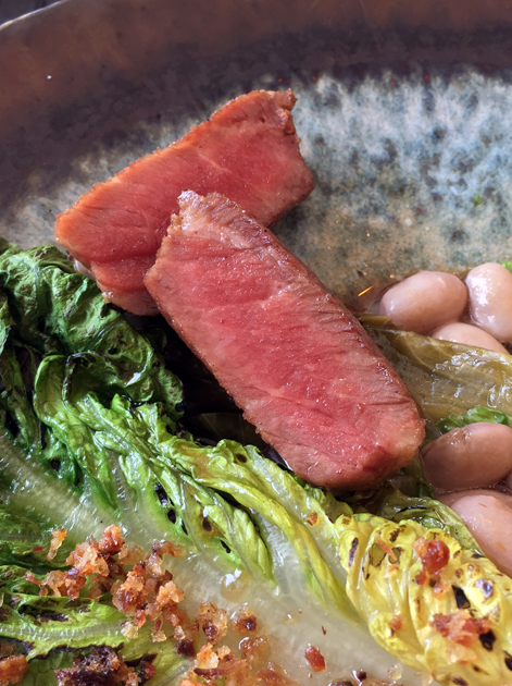 Although the subtle beefy tang of the cow flesh cooked medium may disappoint those looking for a more pronounced beefiness (such as that found in the beef sometimes available at Pidgin), its depth of flavour was nonetheless delightful. It was complimented by the thin and light yet moreishly nutty sauce. Bolder meaty flavours came from the coarse meatball of offal, while supple leaves and gently earthy mushrooms lent this superb dish an autumnal feel.