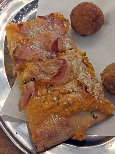 Pumpkin is an odd choice for a pizza topping, especially when it was sweet enough to qualify as a dessert and overpower the tame cured jowl it was paired with. At least the base was relatively fluffy and crisp.