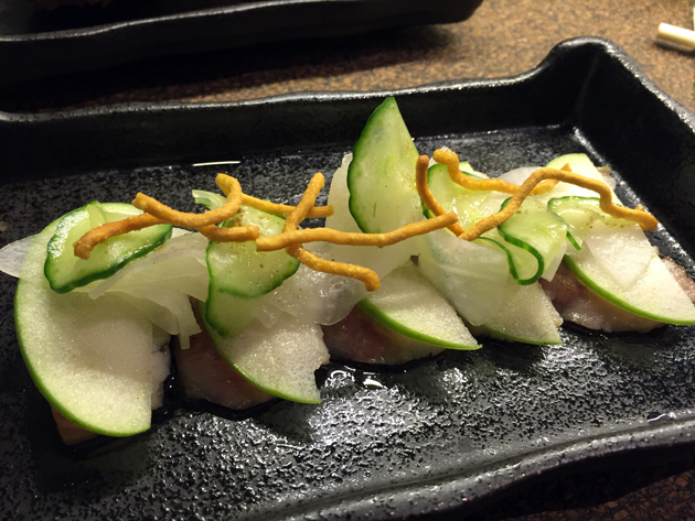 While firm, meaty and slightly vinegary, the mackerel was lacking the zingy punch I usually associate with that fish. It was livened up immensely though by the the moreish miso and sesame dressing as well as by the crisp daikon, vinegary carrots, fiery pickled ginger and sweet cucumbers.