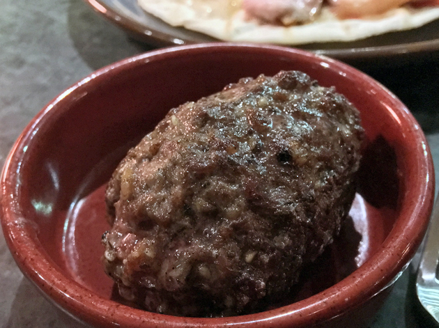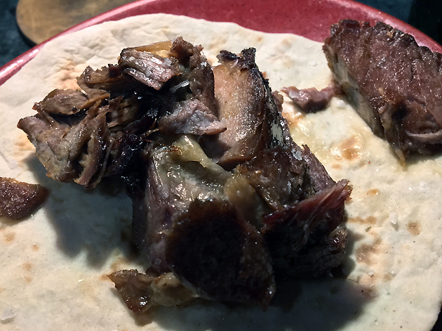 As good as the lamb shoulder was, the smoked beef edged ahead of it in my affections. The smoky bark and the beefy tang of the tender flesh rimmed with connective tissue were simply beautiful, whether served on the prongs of a fork or within the folds of the flatbread.