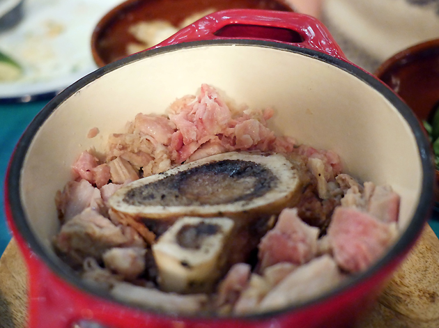 Confit pork tacos were far more satisfying. The meat is served in a pot with the tortillas and garnishes on the side – you assemble each taco yourself. The unctuously moist, tender and fatty qualities of the pork were emphasised by the quivering and equally rich bone marrow – a garnish which, quite inexplicably given how essential it turned out to be, is an optional extra. Small pork scratching crumbs was the best of the garnishes. Not because it added any extra porkiness (which it didn’t and none was needed anyway), but because it provided a neat contrast in texture between dry crispness on the one hand and tender fleshiness and gelatinous wobble on the other. It was, in other words, a success even if I did find myself looking back longingly at the Al Pastor tacos from my first meal.