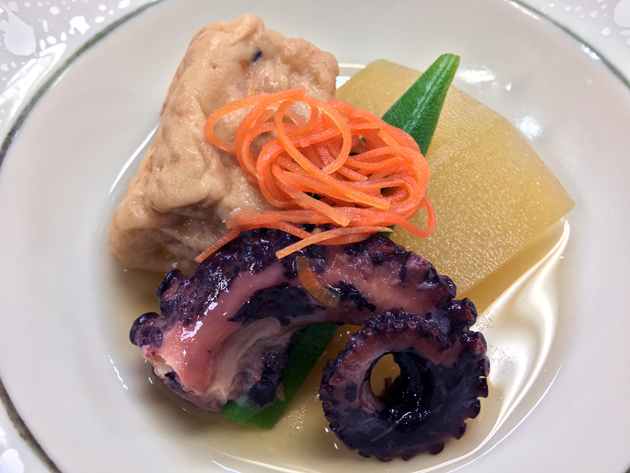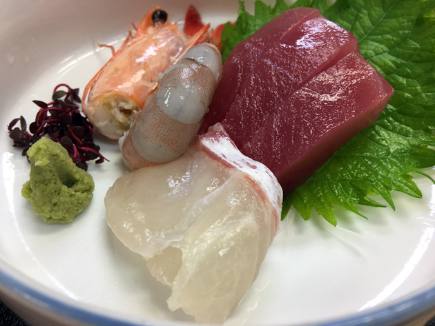 Dinner kicked off with cubes of meaty, firm and glossy tuna sashimi dressed in sesame seeds and a lightly sweet mirin-based glaze. It wasn’t the finest tuna we’d end up having on our trek through Wakayama’s Kii Peninsula (that honour goes to the Hotel Nakanoshima in Kii-Katsuura), but it was pleasing enough – especially when taken with the gently sweet wasabi and crisp radish slice.