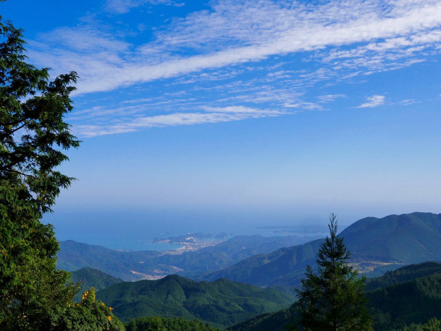 The Kii Peninsula petering out into a chain of islands in the Pacific, including the Hotel Nakanoshima, as seen from a 900m high mountain viewpoint on the Kumano Kodo’s Nakahechi trail.