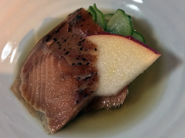 The thin slice of lightly smoked salmon seemed like an unnecessary concession to our Western sensibilities. Its very subtle smokiness and lack of grease allowed the crisp fruit and lightly sharp and brined cucumbers to take centre stage. It was by no means bad – it was just underwhelming compared to the world of both smoked and brined salmon dishes out there.