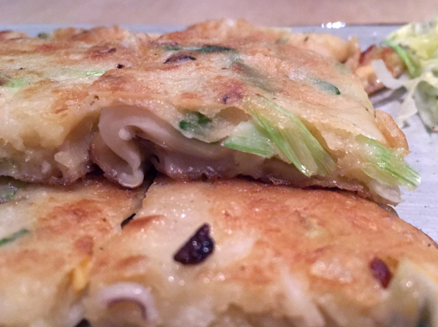The tame kimchi explained the underwhelming nature of the kimchi pancake. Although fluffy and free of excess oil, the kimchi was barely detectable.