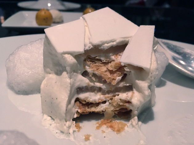 The dessert of millefeuille was not only satisfying, but wonderfully light and refreshing too. A squidgy vanilla coating gave way to reveal gently crisp layers of pastry tinged with jasmine which meshed seamlessly with the gently floral pepperiness of the foam blobs.