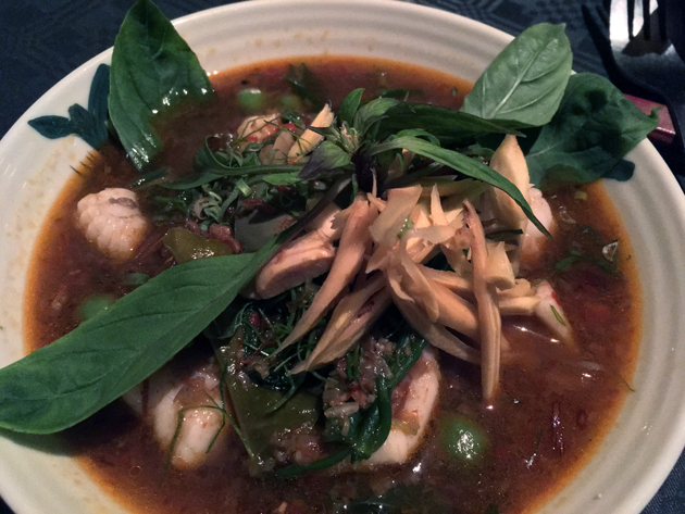 Cured salmon strips seems more British than Thai, but that hardly matters when the taut, meaty and subtly sweet strips came dressed in a bristlingly hot and zingy dressing. The julienned vegetables were no afterthought, with every slice sharp and crisp.