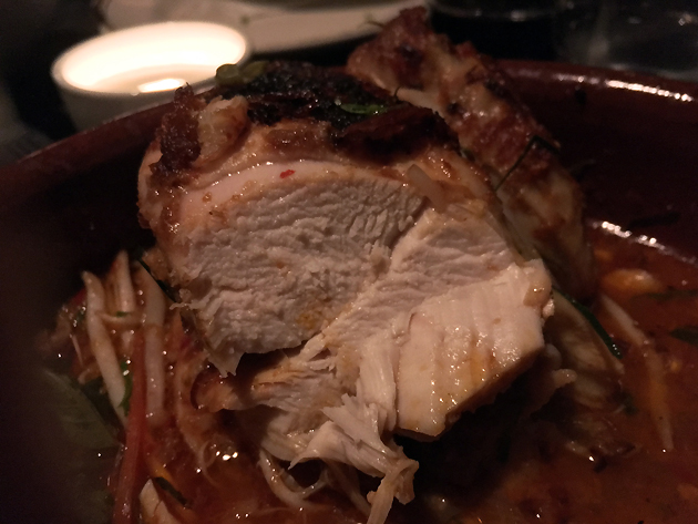 A jungle curry made with fish instead of meat of the two- or four-legged variety is unusual, but it worked really well. Springy pearlescent dabs of white fish came bathed in a thin yet sharp, sour and umami sauce. It also packed a lip-tingling cumulative heat that stopped just short of slicking my brow with sweat – one of the very few dishes at Farang to do so. This dish wasn’t just fish and curry sauce though – more layers of taste and texture came from crisp spherical Thai baby aubergines, pepper corns, fragrant holy basil and sharp galangal.