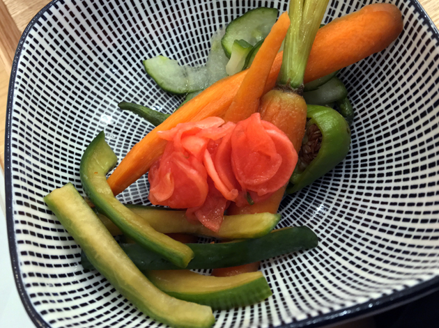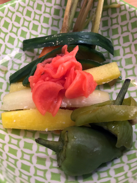The constituent vegetables in the selection of Japanese pickles continued to vary, but the general decline in quality and quantity was noticeable with markedly less distinctiveness in every bite.