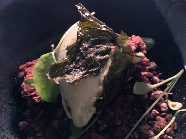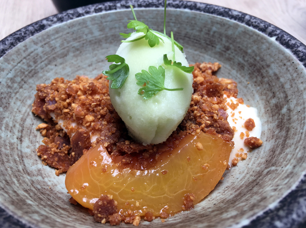 An earthy, sinewy chunk of lamb neck, with some segments still attached to bone, crowned a nutty, creamy and grainy head of polenta. The broccoli was neither here nor there, but that didn’t matter. An umami dressing and a puree that somehow managed to remind me of both sesame and prunes both helped elevate the meat-grain combo to new heights. Labneh-like squirts of yoghurt refreshed the palate in preparation for the desserts to come.