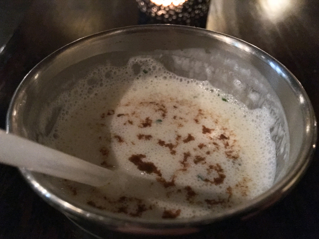 Pre-dessert was a creamy yet still light and refreshing malai. The milky cream, crisp almond shavings and oddly crunchy candied fruit all came together beautifully. It was far better than the somewhat similar malai-with-candied-fruit dessert at the admittedly far more relaxed Bombay Bustle.