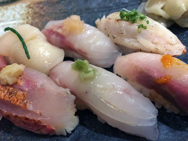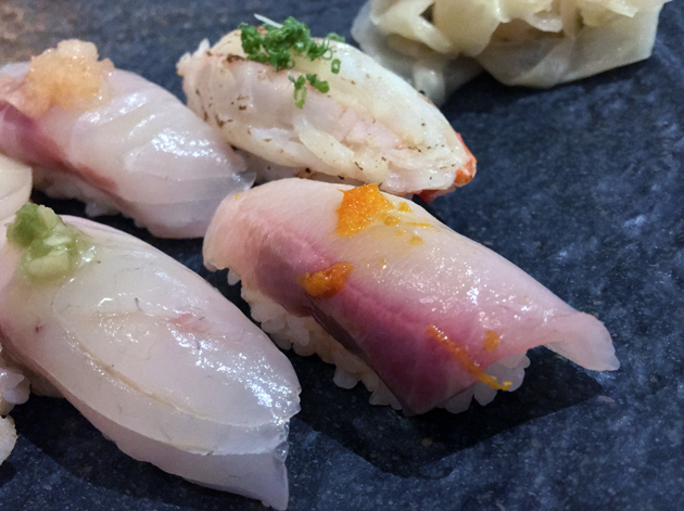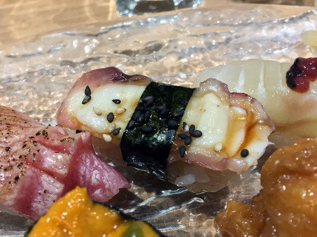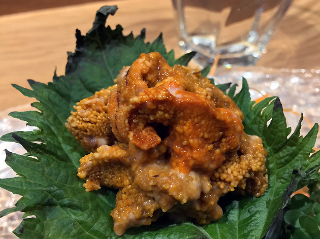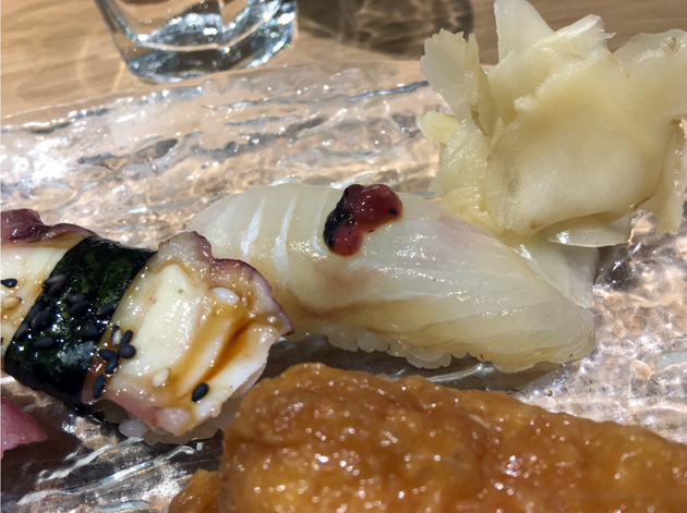 Sea urchin sashimi not only had an intricate, almost-fractal appearance to it, it was also a beautiful thing to behold in the mouth. It had a gently creamy start with a briney, mineral-ish follow-through and a crisp, clear aftertaste. The only duff note here was the wasabi chosen to accompany the sea urchin. Its nasal burning fieriness is what most people expect from wasabi, but the more nuanced versions from previous meals would’ve been a more apt accompaniment.