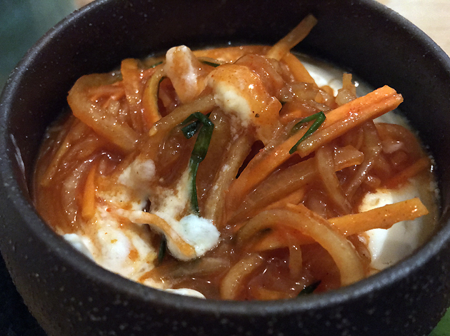 Although the steamed gyoza had supple and sturdy skins, the pork filling was rather dreary – these little dumplings just couldn’t match the standard set by Kyoto’s Hohei Gyoza. A far better starter/side dish was the chawanmushi-style tofu. The wispy yet wheaty tofu came topped with sour and very modestly spicy kimchi. While not exactly a glove-like fit, it was a nonetheless pleasing combination.