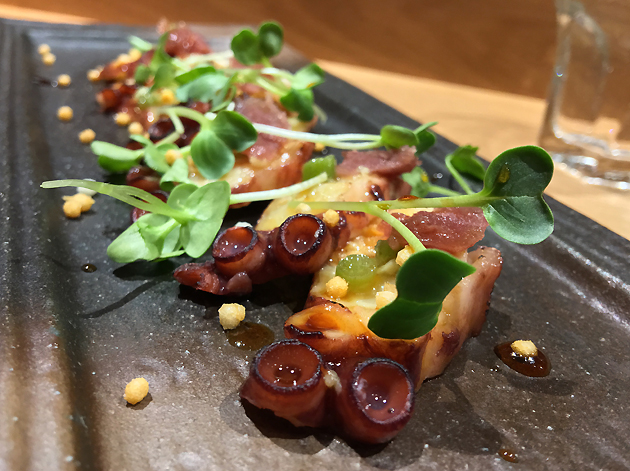 You’re better off with the octopus ‘carpaccio’ which was far more subtle and substantially less gimmicky than I expected. The thin yet meaty smooth slices of cooked cephalopod were the perfect textural conveyor for the nuttiness of its glaze and accompanying morsels of puffed rice. The gentle heat, sweetness and vinegariness of the wasabi was the finishing touch on this unexpected masterpiece.