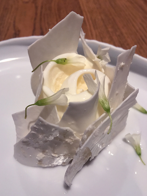 Gamey goose cooked rare was the only red meat dish of the evening, but it came smothered in chopped, fried kale for some reason. The frying made the kale resemble the fried, chopped and salted cabbage often passed off as ‘seaweed’ in many Chinese takeaways. Even if it didn’t have this unfortunate association, the kale was just out of place next to the otherwise well-prepared slices of goose. The maple-like sweetness of the birch sap was a bit too much though, especially when taken with the celeriac cream, overpowering the goose. An unbalanced, unsatisfying and misguided dish.