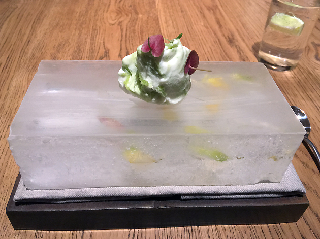 A shrug-inducing dollop of ice cream was noteworthy only for being served on a hefty big rectangle of ice. There were even frozen flower petals inside the ice block, suggesting that possibly more thought had gone into this over-engineered plate substitute than into the ice cream itself. There are skewed, skwiffy priorities. Then there’s this unintentional joke at the kitchen’s expense.