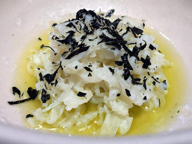 Lightly chewy cubes of raw tuna were sashimi-esque, but the small cubes didn’t do the fish any favours texturally. This dish was rescued by the creamy sweetness and gentle heat of the nuanced wasabi and the umami tang of caviar. The two toppings got along like a house on fire.