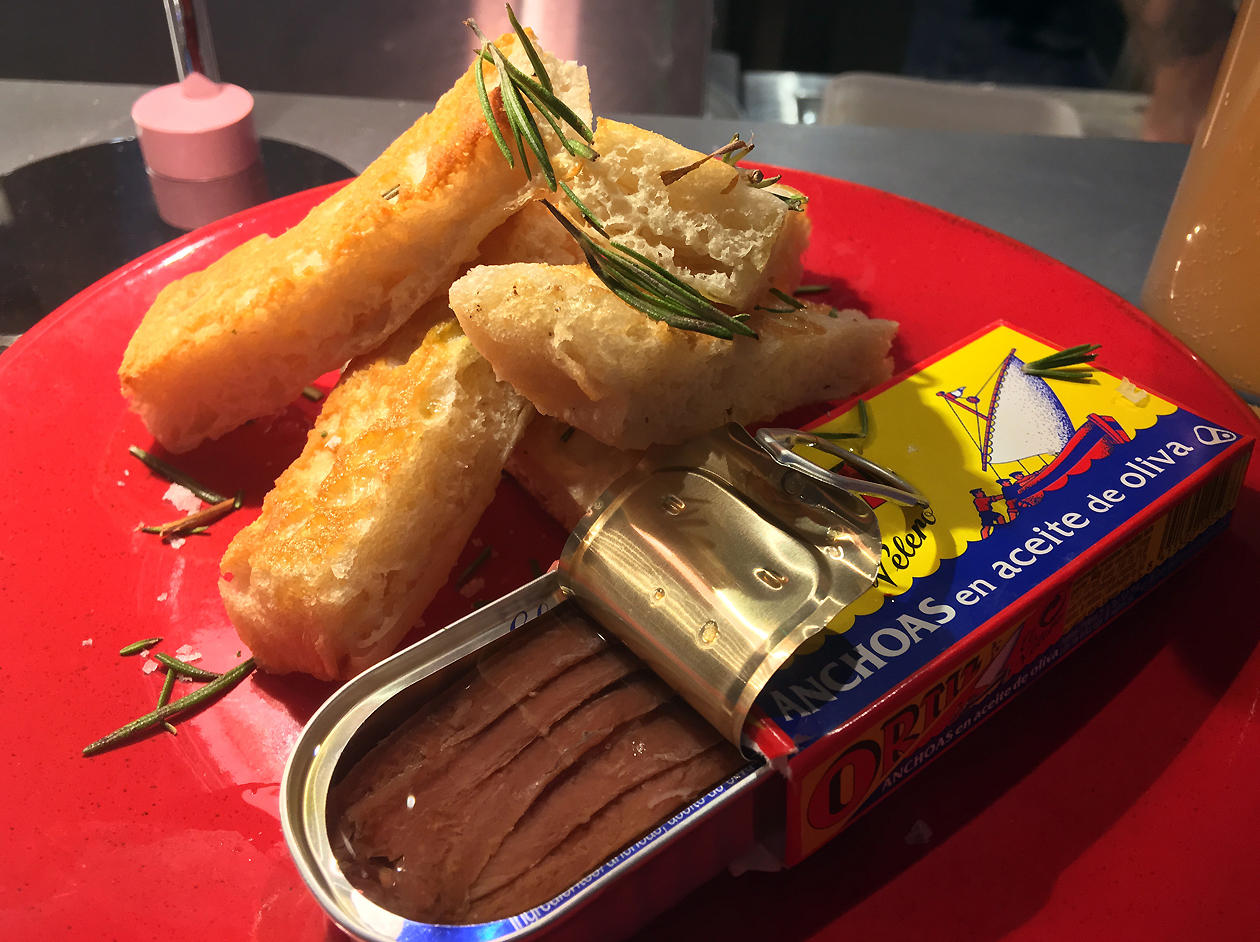 The box-and-tin-can presentation of the anchovies was a bit twee, but it didn’t detract from the salty umami punch of the little fishies. While not as potent as many of the Cantabrian anchovies I’ve had in the past, there were still delightful enough for me to overlook the oddly leaden bread soldiers.