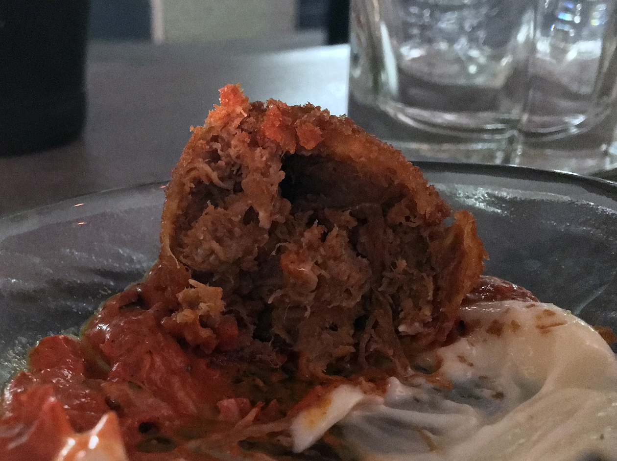 A croquette of doner meat was technically excellent – a crisp crumb shell with a sinewy, meaty interior. A spicy tomato sauce and refreshing yoghurt on the side were apt accompaniments. But that’s ‘croquette’ in the singular, which would be meagre for a bar snack or tapas dish neither mind a starter.