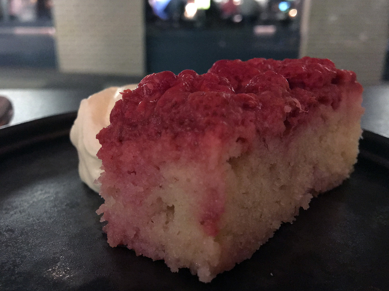 Early autumn saw the raspberry cake replaced by a large fudge ‘cookie’. The gently crunchy crust gave way to reveal a fluffy, chewy interior, the whole thing drenched in a tangy, sticky fudge. This dessert was as much a take on sticky toffee pudding as it was an embiggened cookie, even with the thin, milky cream drizzled on top.